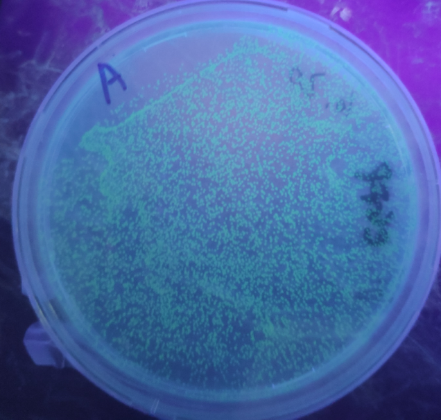 When Aca1 is mutated at its 44th amino acid (Arginine to alanine, Aca1R44A cannot inhibit the downstream acr promoter), the differential expression level of green fluorescent protein could be easily observed with naked eyes: